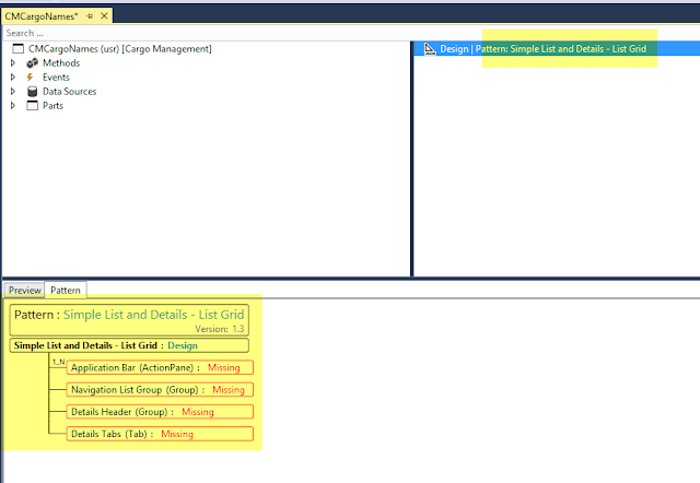 Lets apply Simple list and detals - list grid pattern to our form. Once we apply the pattern, the expected form desing pattern is populated in the pattern tab. It shows which controls are missing, to match it to the pattern